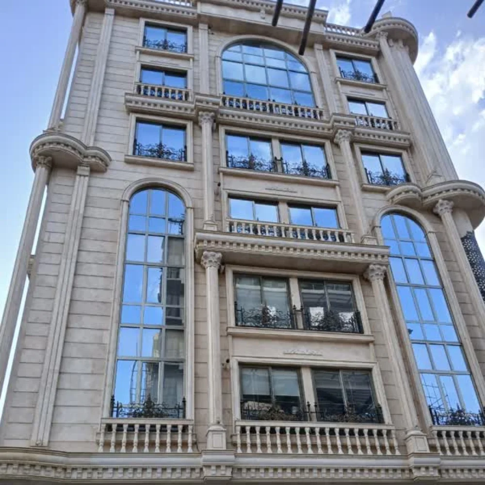 برای افزایش عایقکاری صوتی و حرارتی، از شیشههای دوجداره با پوشش رفلکس سیلور (نقرهای) استفاده شده است. این شیشهها با خاصیت بازتابدهی نور خورشید، ضمن کاهش گرمای ورودی در فصل تابستان، از اتلاف گرما در فصل زمستان جلوگیری میکنند. ظاهر آینهای آن نیز به زیبایی نما افزوده و مانع از دید مستقیم به داخل در طول روز میشود.